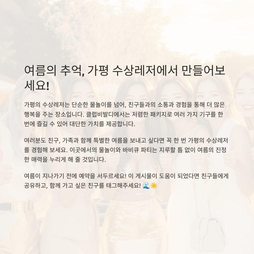 여러분도 친구, 가족과 함께 특별한 여름을 보내고 싶다면 꼭 한 번 가평의 수상레저를 경험해 보세요. 새로운 기억을 만드는 것은 그렇게 멀지 않은 곳에 있습니다.
