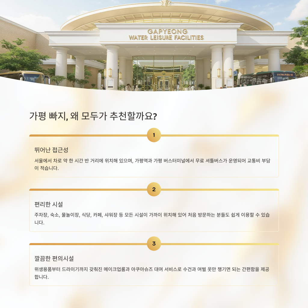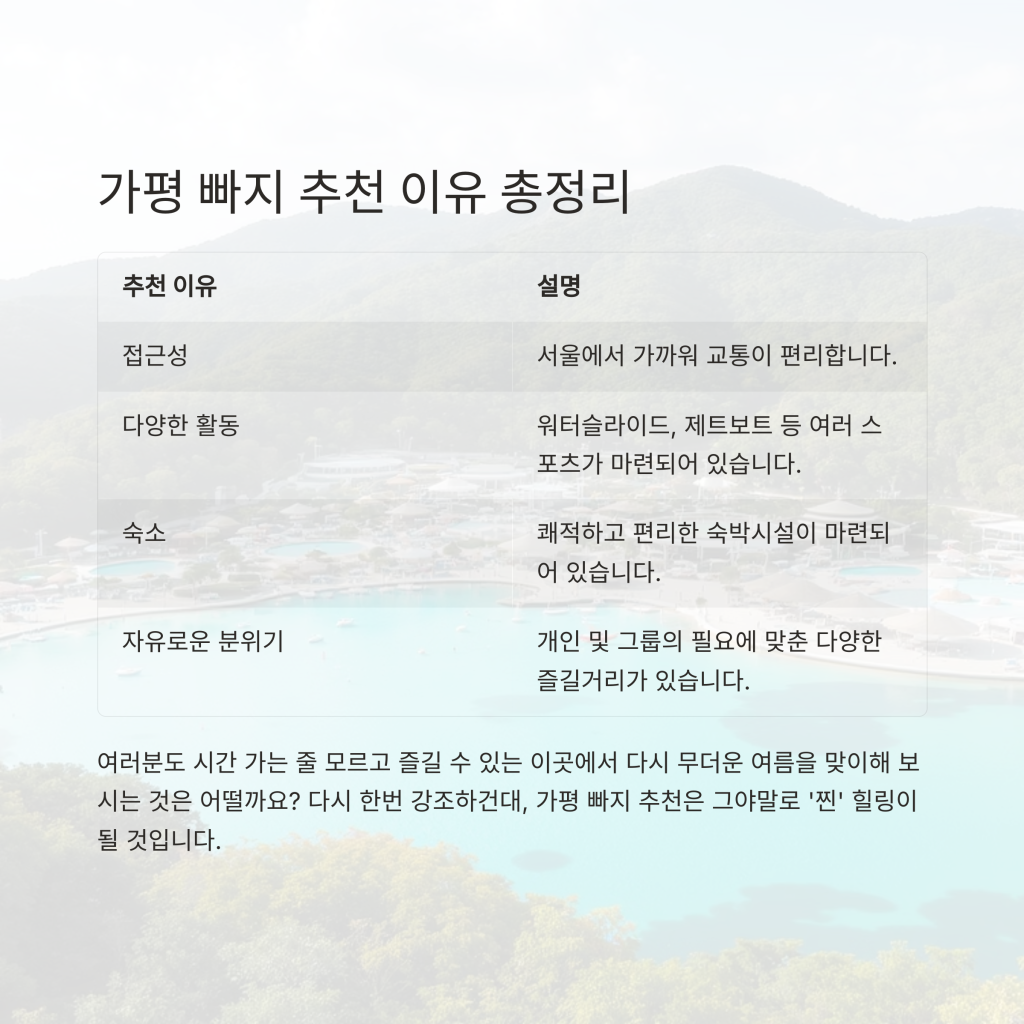 이곳은 물놀이를 즐길 수 있는 다양한 시설과 액티비티가 마련되어 있어, 누구나 쉽게 찾아가고 즐길 수 있는 최적의 장소입니다. 특히 가평에서의 물총싸움이나 웅장한 워터슬라이드는 친구들과의 소중한 추억을 만들어 주었습니다.