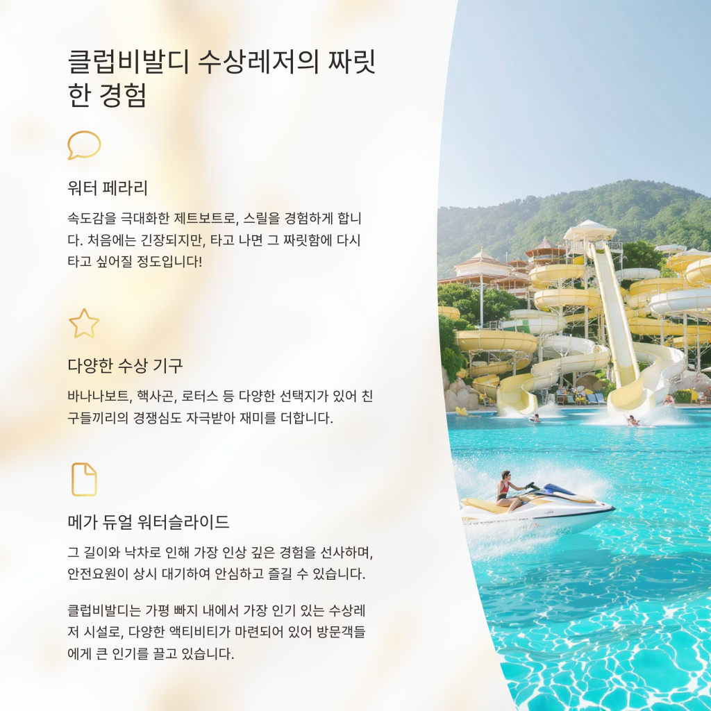 특히 클럽비발디에서는 저렴한 패키지로 여러 가지 기구를 한 번에 즐길 수 있어 대단한 가치 제공이 이루어집니다. 또한, 안전한 장비가 무료로 제공되어 안심하고 물놀이에 집중할 수 있습니다.