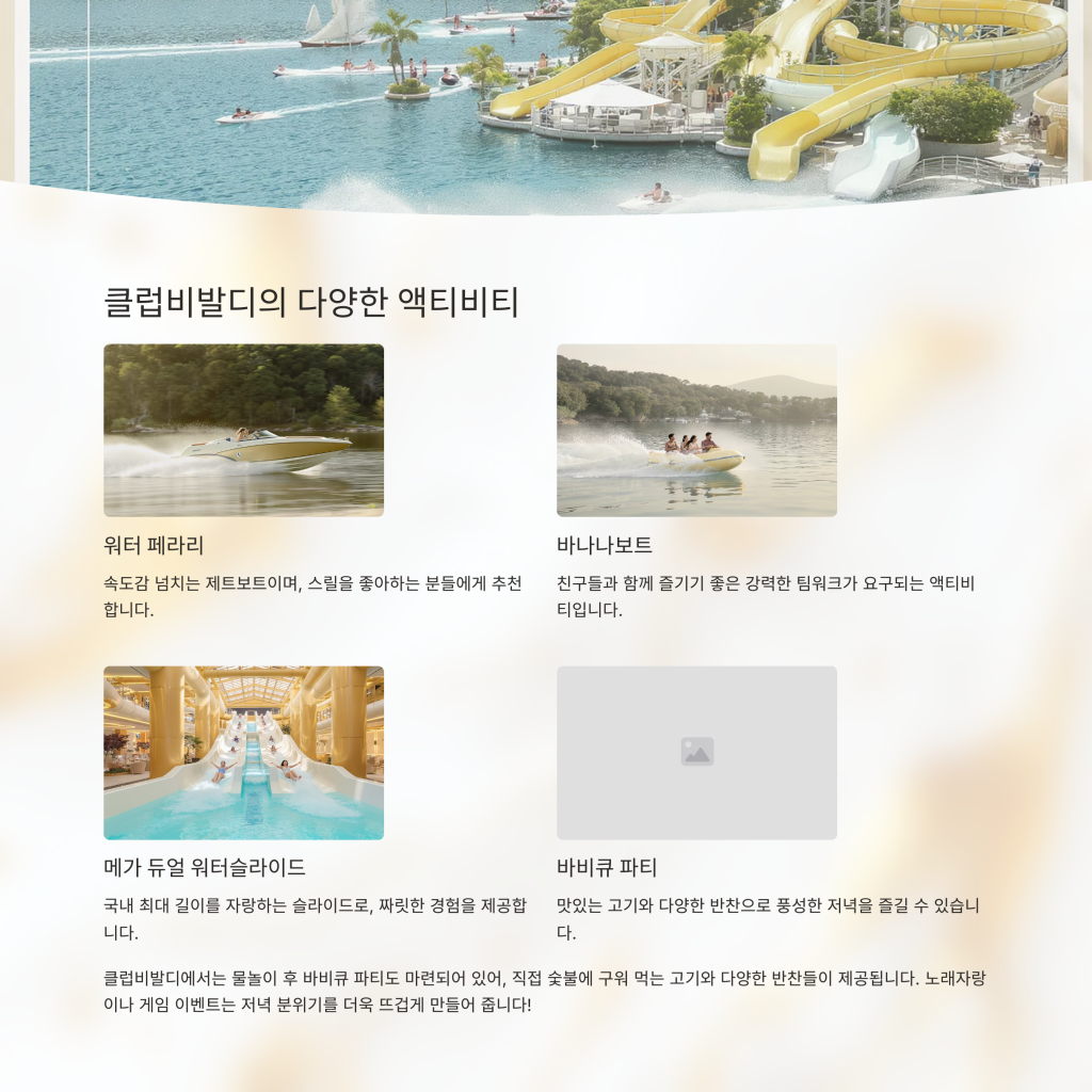 | 다양한 활동 | 워터슬라이드, 제트보트 등 여러 스포츠가 마련되어 있습니다. |