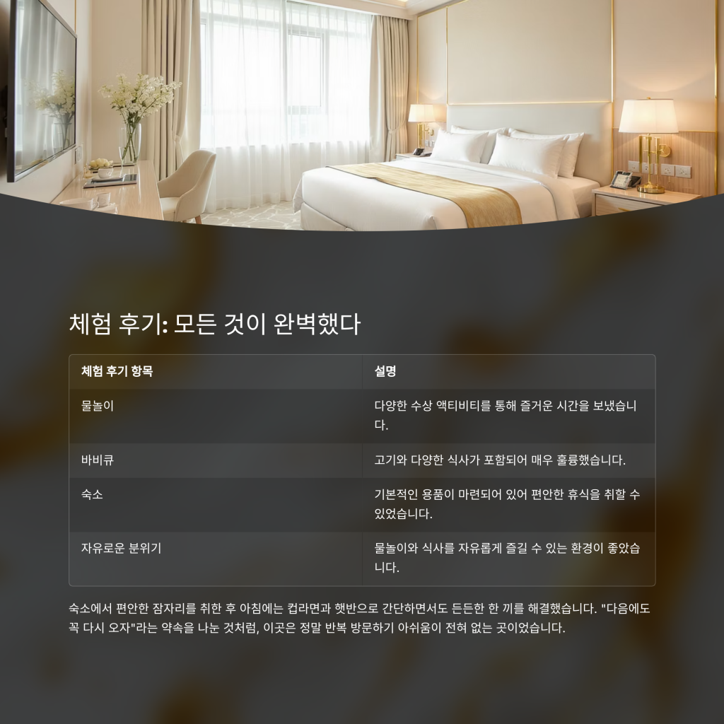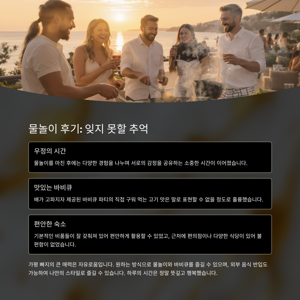 물놀이를 마친 후에는 다양한 경험을 나누며 서로의 감정을 공유하는 우정의 시간도 이어졌습니다. 우리가 물놀이를 즐기고 있을 때 배가 고파지자 바비큐 파티가 제공되었고, 직접 구워 먹는 고기의 맛은 말로 표현할 수 없을 정도로 훌륭했습니다.