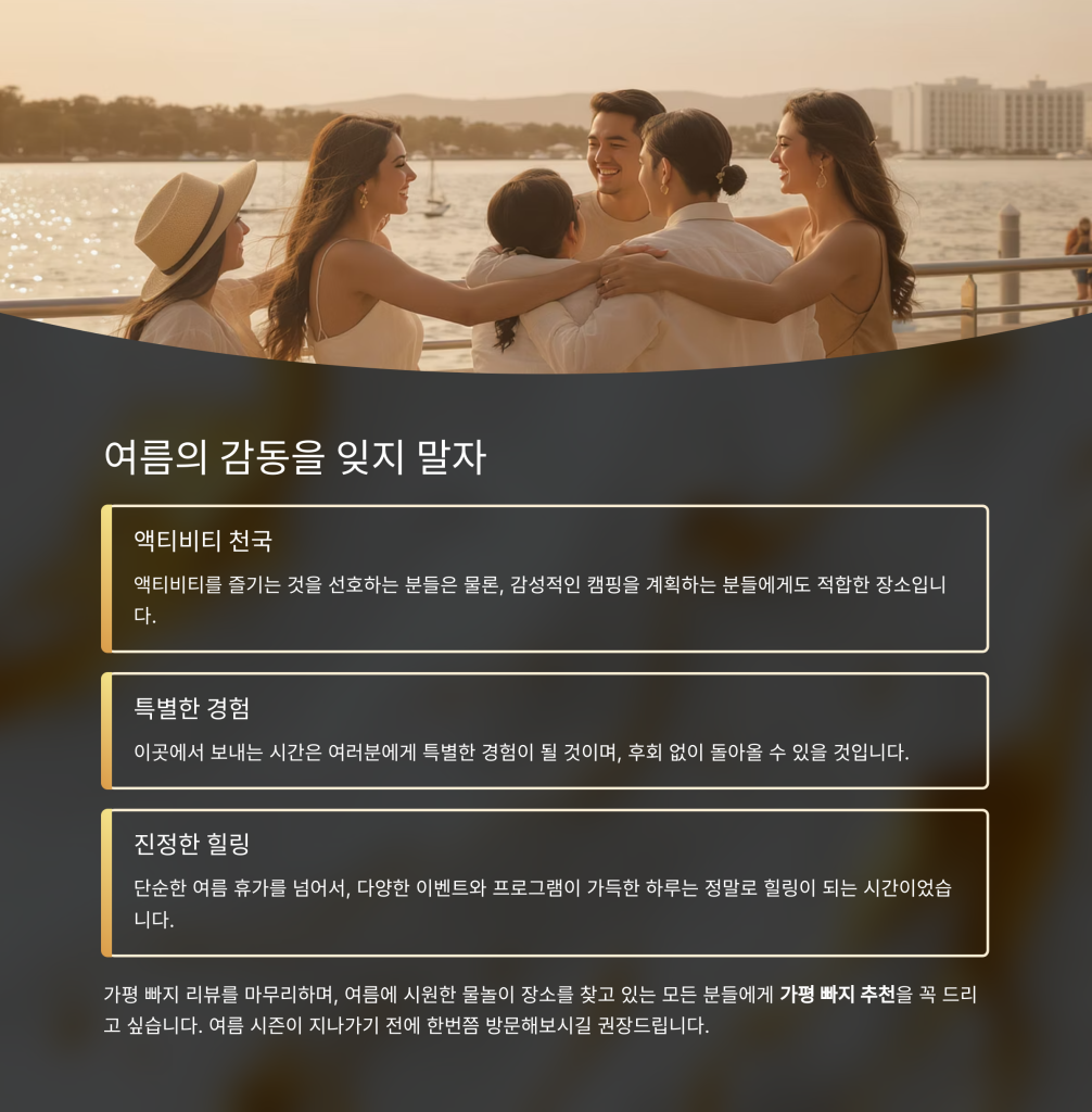 또한, 가평 빠지에서의 하루는 그저 물놀이를 넘어서, 다양한 이벤트와 프로그램이 가득한 하루였습니다. 이는 단순한 여름 휴날의 탈피를 넘어 정말로 힐링이 되는 시간이었습니다.