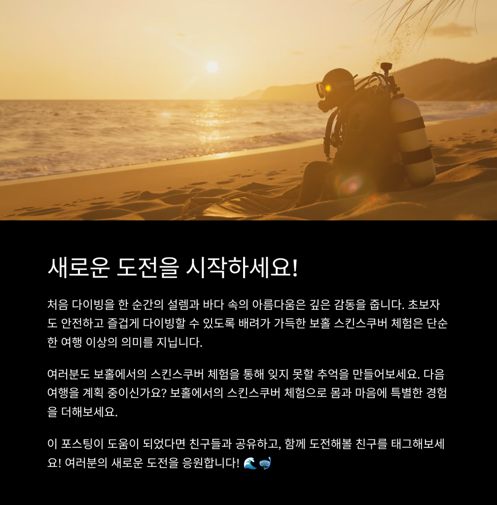 여러분께 보홀 스킨스쿠버체험을 통해 느낀 감정과 경험을 함께 나누게 되어 기쁩니다. 처음 다이빙을 한 순간의 설렘과 바다 속의 아름다움은 저에게 깊은 감동을 주었습니다.