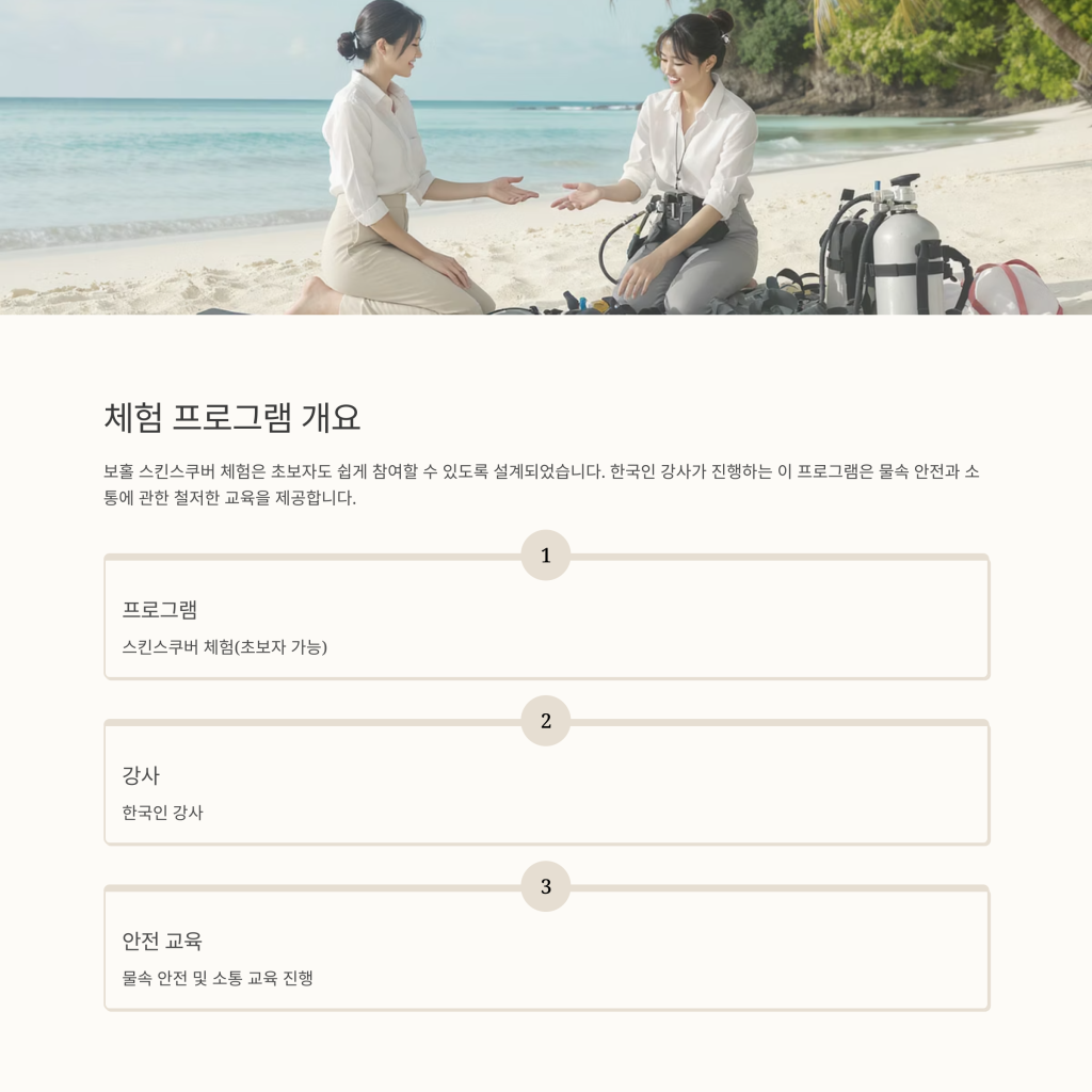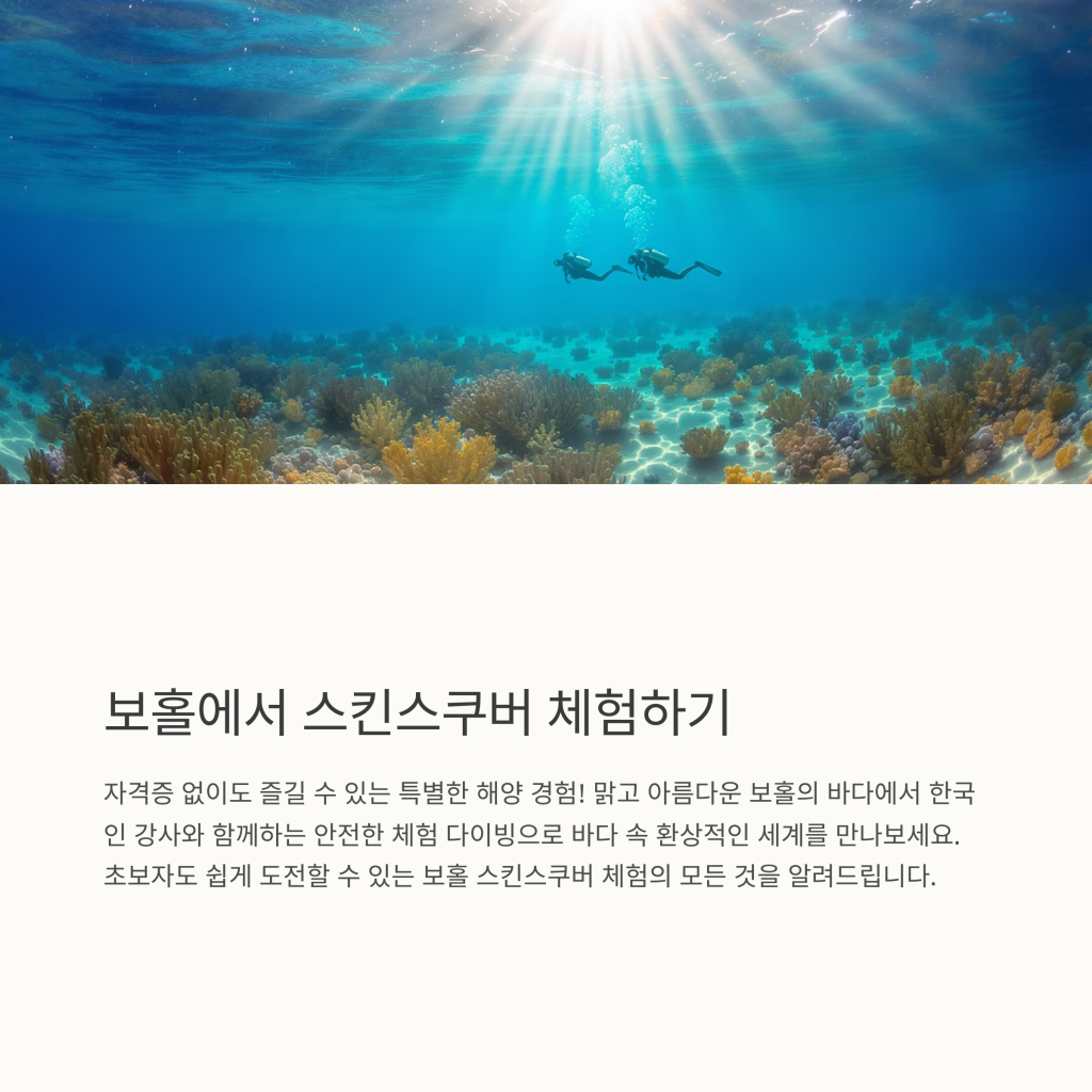 스킨스쿠버 체험은 해양의 아름다움을 직접 체험할 수 있는 기회로, 많은 이들에게 매력적인 경험을 제공합니다. 특히 보홀처럼 맑고 깨끗한 바다에서의 체험은 더욱 특별합니다.