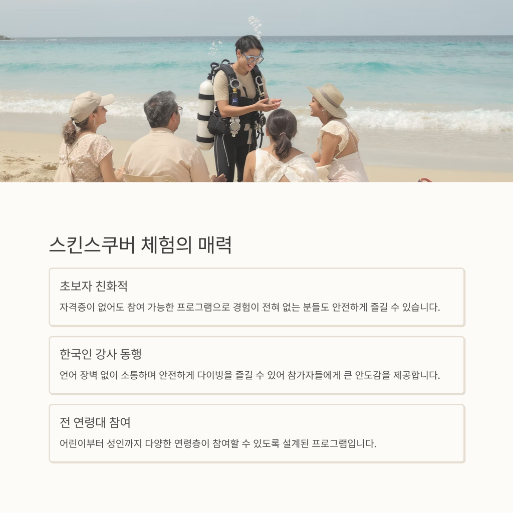| 프로그램 | 스킨스쿠버 체험(초보자 가능) |