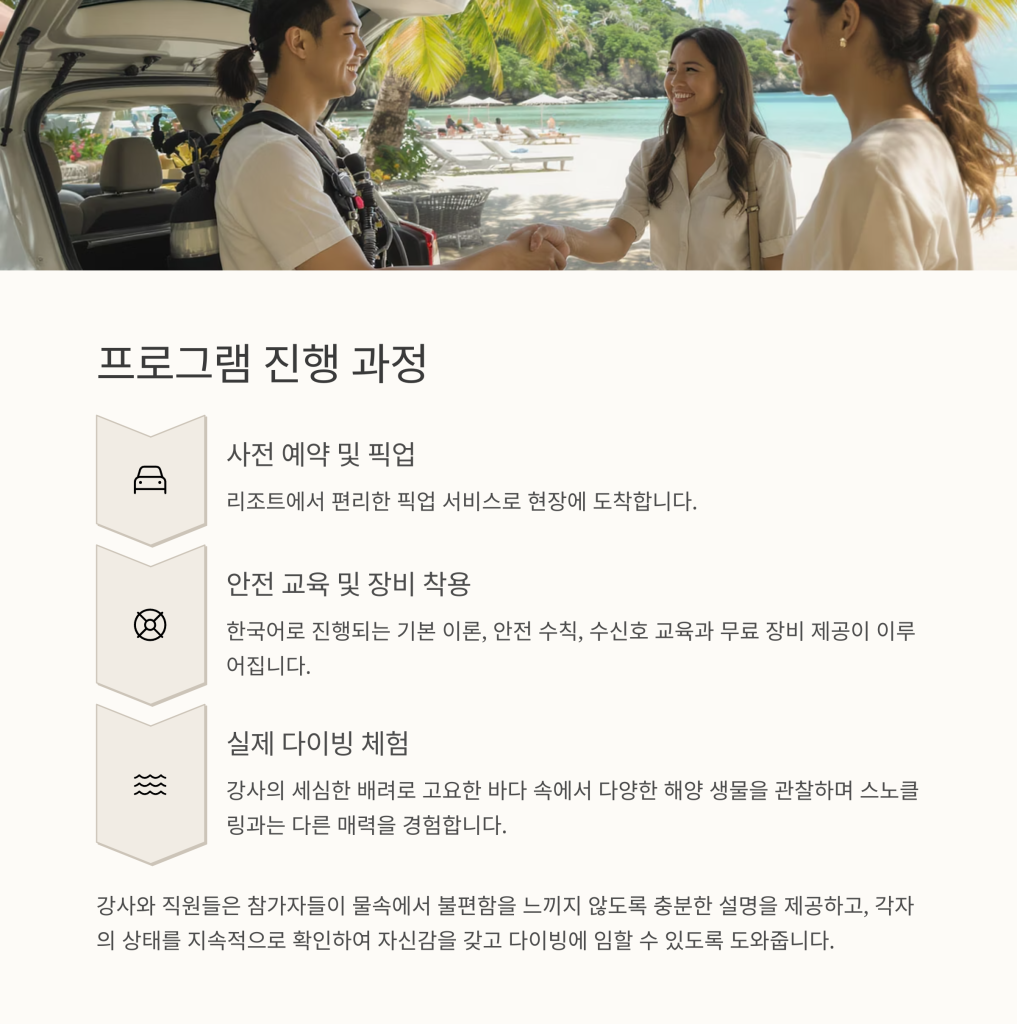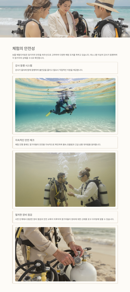 강사와 직원들은 참가자들이 물속에서 불편함을 느끼지 않도록 사전에 충분한 설명을 하며, 참가자 각자의 상태를 확인합니다. 이를 통해 모든 참가자는 자신감을 갖고 다이빙에 임할 수 있습니다.