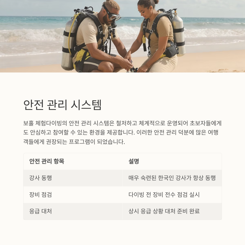 | 장비 점검 | 다이빙 전 장비 전수 점검 실시 |