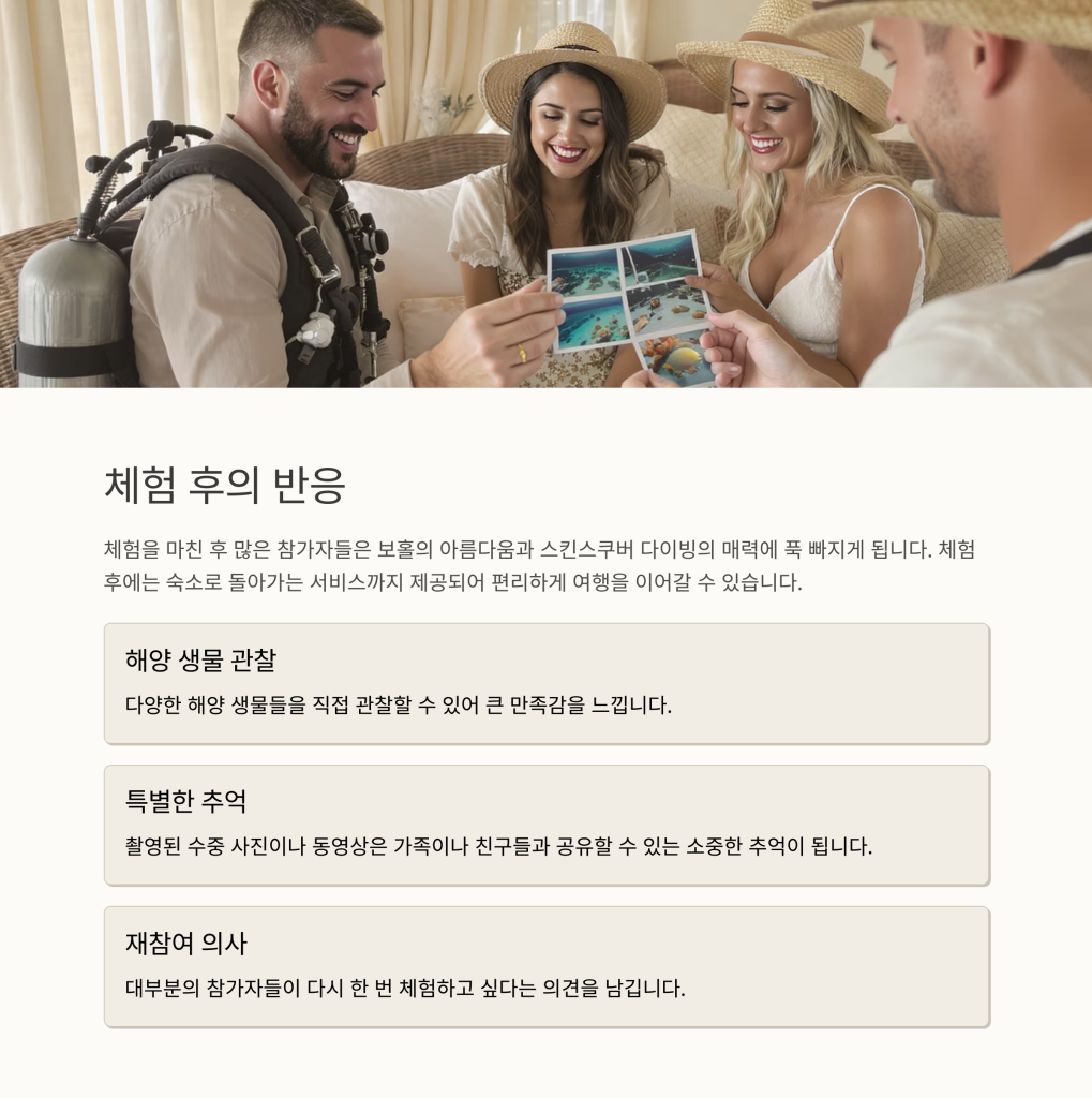 체험을 마친 후 많은 참가자들은 보홀의 아름다움과 함께 스킨스쿠버 다이빙의 매력에 푹 빠지곤 합니다.