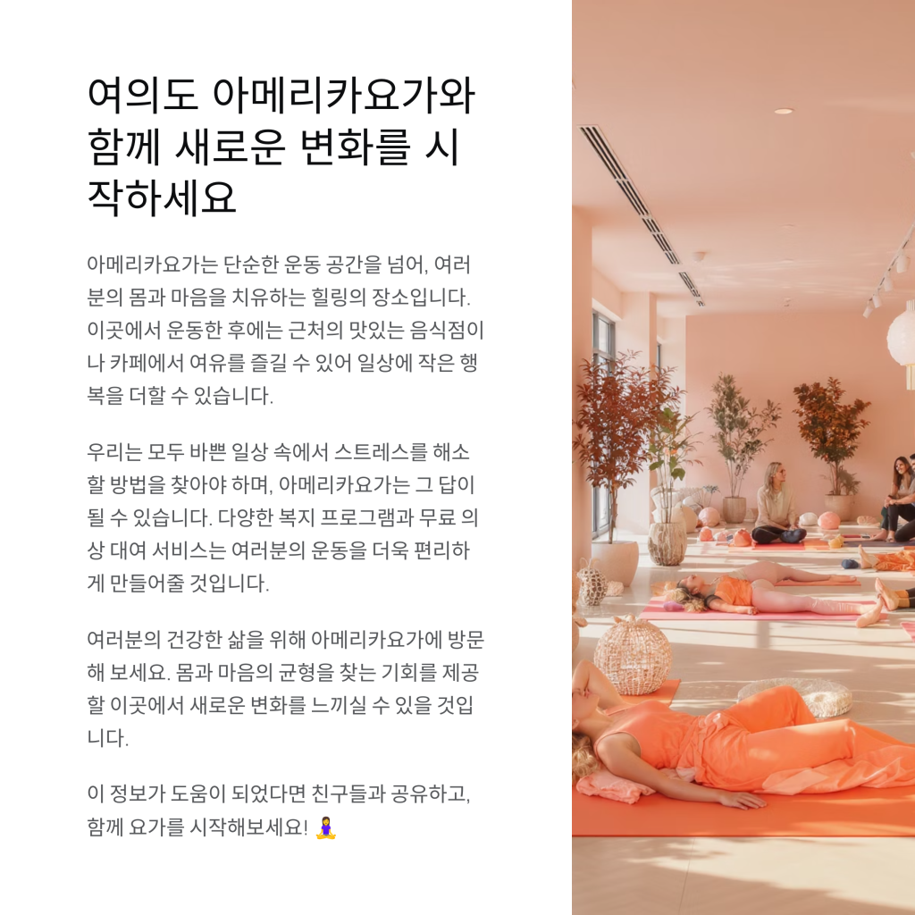 여의도에서 특별한 운동 경험을 찾고 계신가요? 아메리카요가는 직장인과 여성들에게 최적화된 요가 전문 센터로, 체형 교정 및 다이어트 효과를 동시에 얻을 수 있는 공간입니다. 바쁜 업무에 지친 여러분을 위해 아메리카요가는 편안하고 깨끗한 환경을 제공합니다.