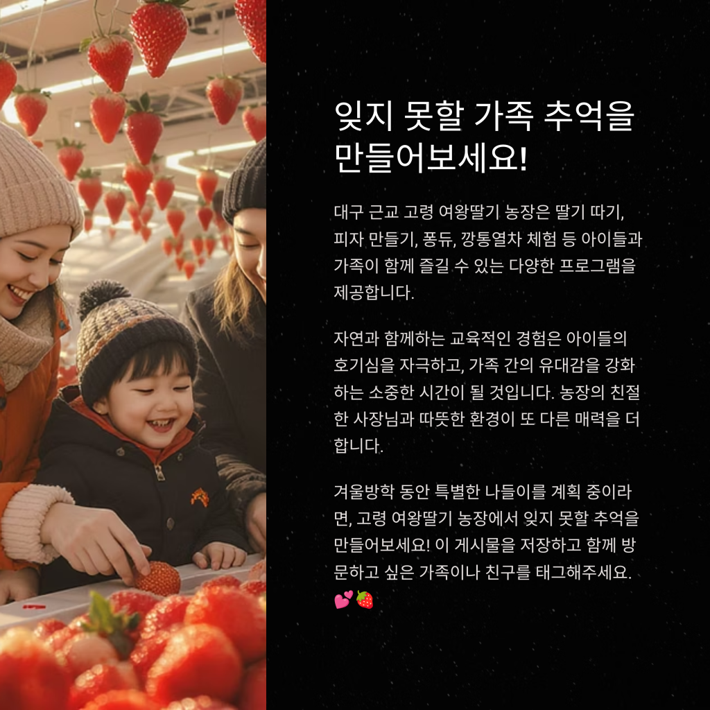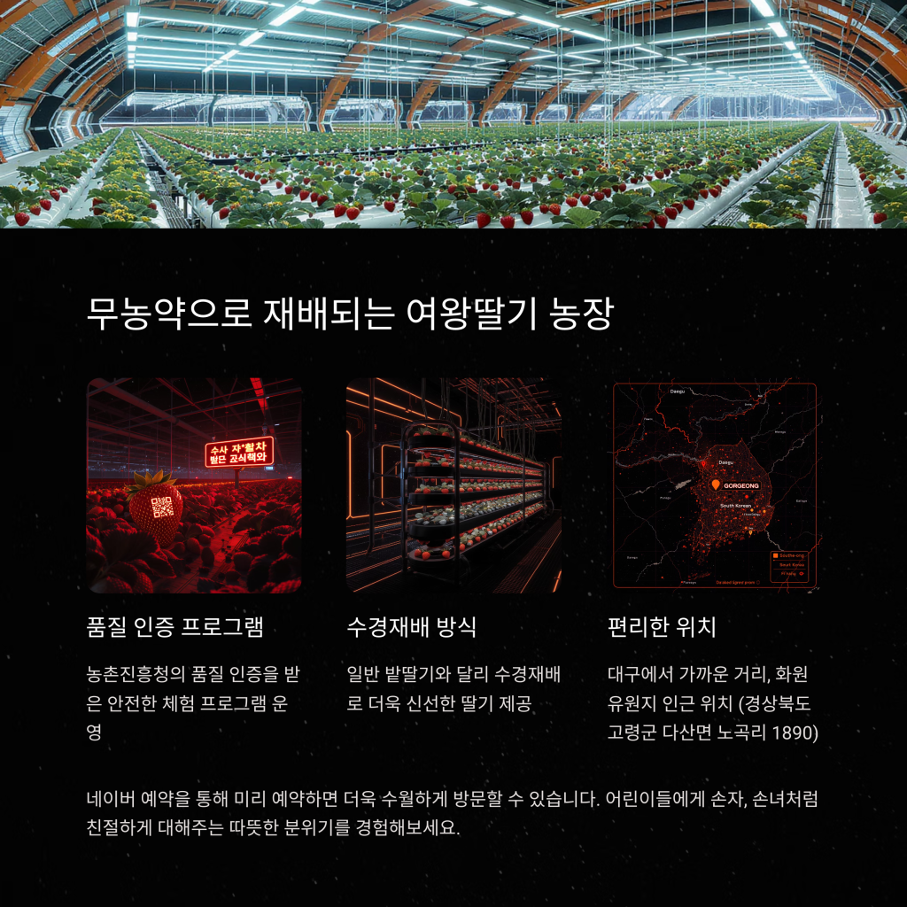 대구 근교의 고령 여왕딸기 농장은 다양한 체험과 함께 소중한 추억을 만들어 갈 수 있는 장소입니다.