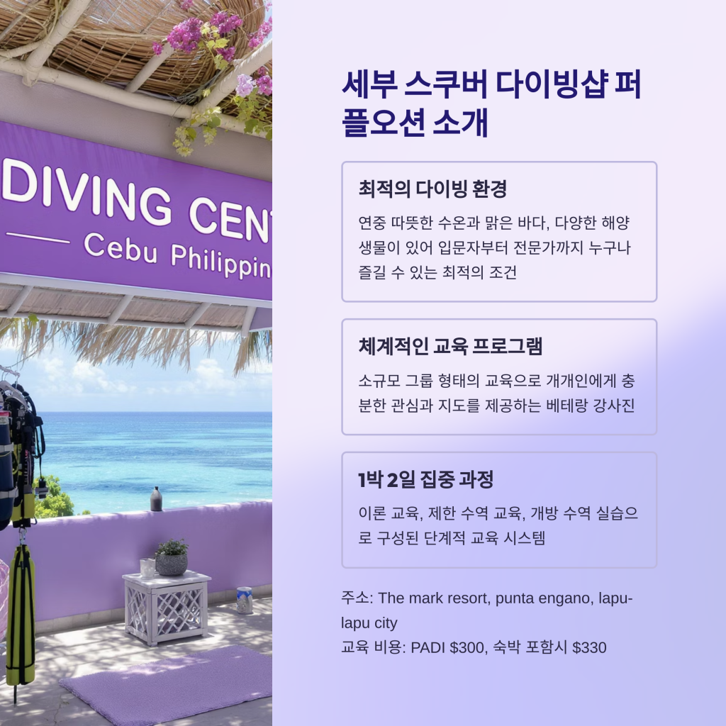 필리핀 세부의 막탄 지역에 위치한 퍼플오션 다이빙샵은 스쿠버 다이빙을 배우고 경험하기 위해 많은 이들에게 사랑받고 있는 공간입니다. 이곳은 특히 연중 따뜻한 수온과 맑은 바다, 다양한 해양 생물이 있어 입문자부터 전문가까지 누구나 다이빙을 즐길 수 있는 최적의 조건을 갖추고 있습니다.