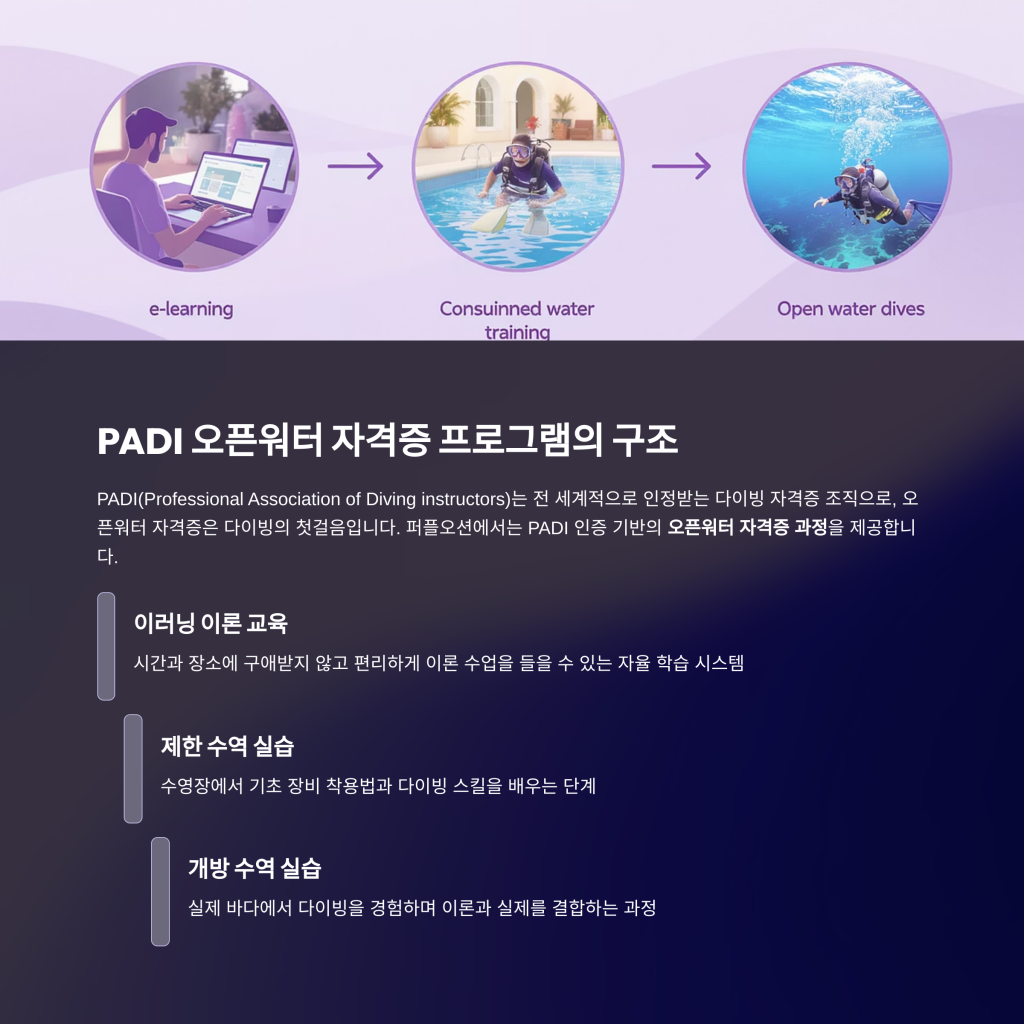 퍼플오션에서는 오픈워터 자격증 과정을 포함한 다양한 교육 프로그램을 운영하고 있습니다.