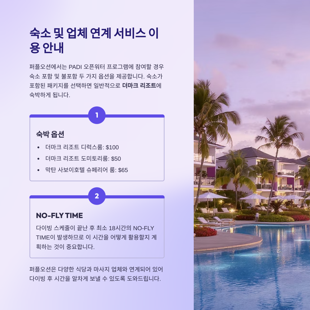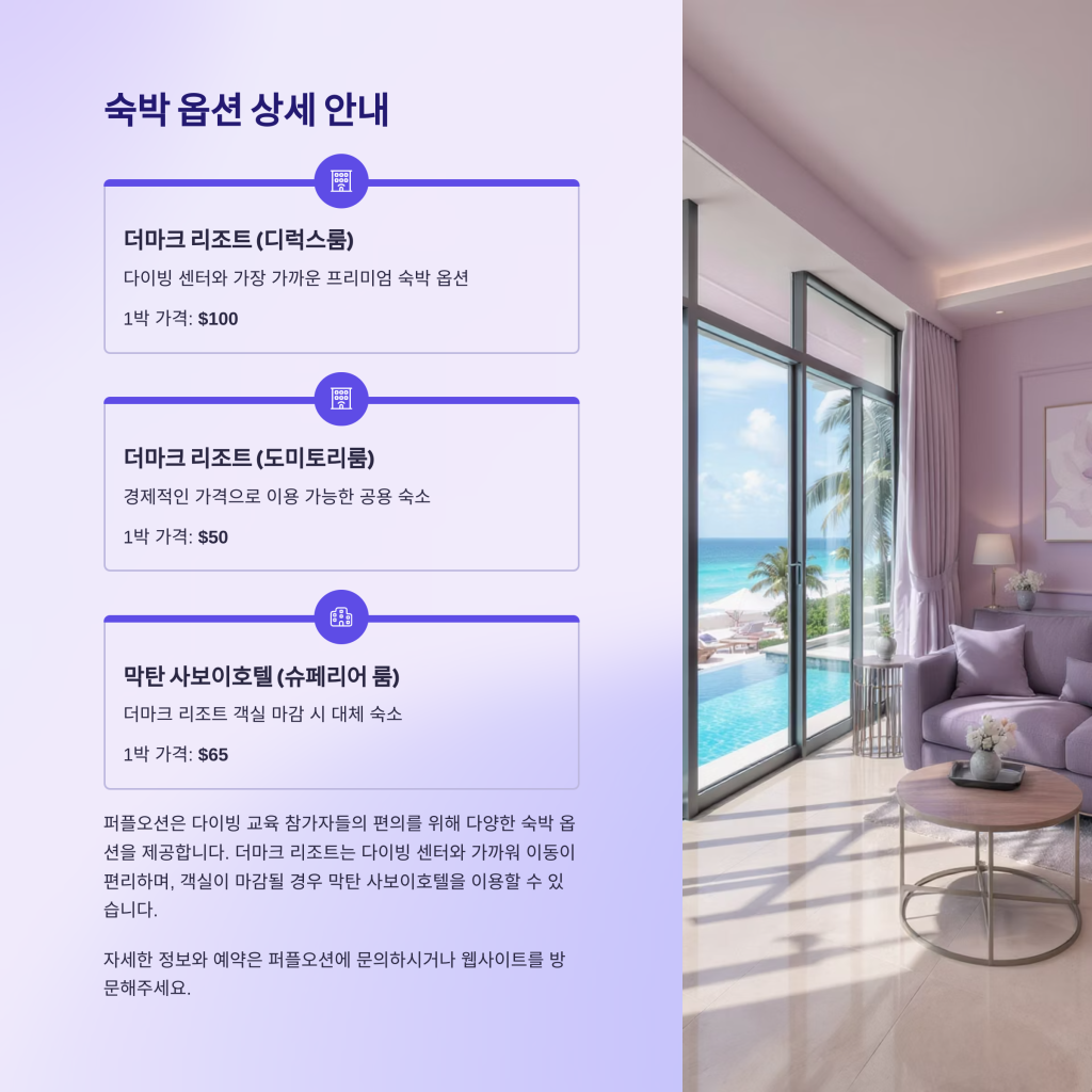 퍼플오션에서는 PADI 오픈워터 프로그램에 참여할 경우 숙소 포함 및 불포함 두 가지 옵션을 제공합니다. 숙소가 포함된 패키지를 선택하게 되면, 일반적으로 더마크 리조트에 숙박하게 되며, 이곳은 다이빙 교육을 받기에 알맞은 위치와 시설을 갖춘 곳입니다.