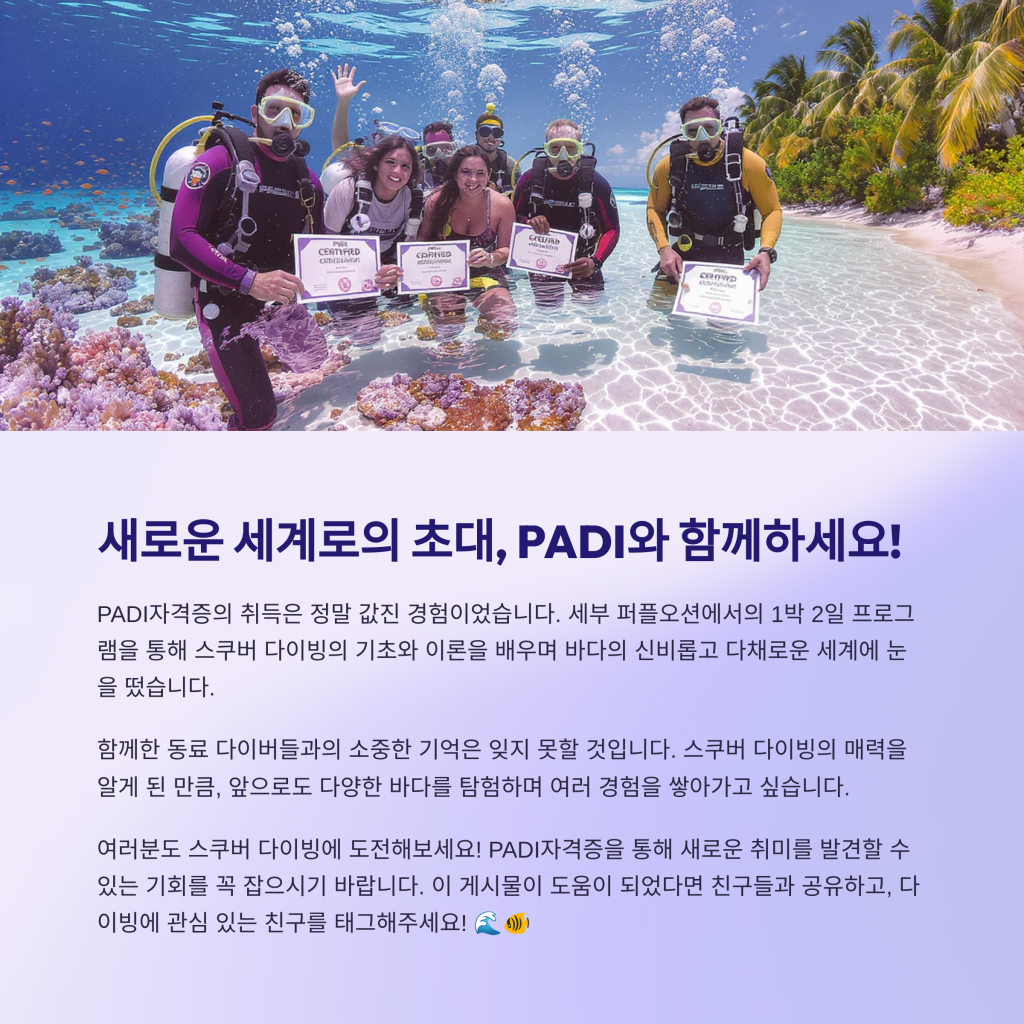 여러분도 스쿠버 다이빙에 도전해보세요! PADI자격증을 통해 새로운 취미를 발견할 수 있는 기회를 꼭 잡으시기 바랍니다. 세부에서의 경험이 여러분의 다음 여행에 도움이 되기를 바라며, 안전한 다이빙과 즐거운 탐험을 기원합니다.